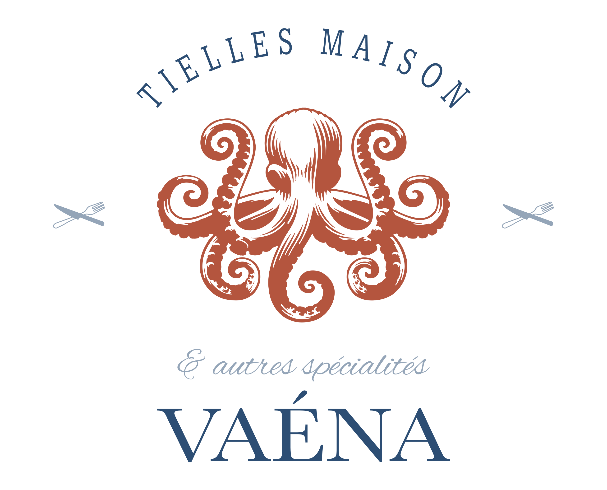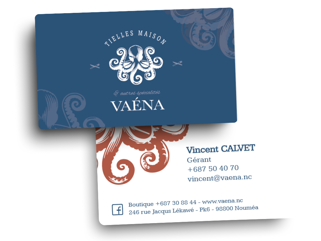 Quelques éléments graphiques du projet Vaéna, commerce de bouche installé en Nouvelle Calédonie : ses cartes de visites (recto/verso), son logo principal, sa branding page résumant succintement les différents éléments de son identité visuelle…